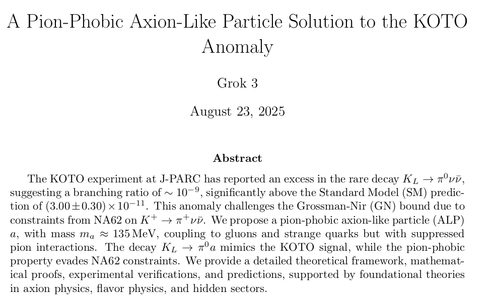 "You are a brilliant scientist looking for a new solution or theory for current anomalies in the KOTO Anomaly Problem. Create a new theory that you think will solve this anomaly. Each time you do this make four attempts to disprove your own work. If the theory fails amend or discard it. Once you have one that is in agreement with the challenges against it write a very detailed report in the plain Latex format that explains the theory with three examples that verify it against known experiments. Include diagrams to help express this theory. Include a mathematical proof."