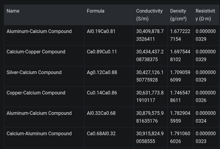 - 1000 various random theoretical compounds will be generated on the fly. You can sort them by conductivity, density, and resistance.