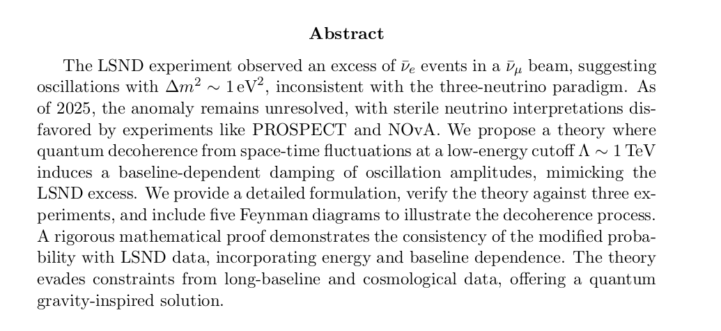 Grok 4: Quantum Decoherence from Space-Time Fluctuations for the LSND Neutrino Oscillation Anomaly