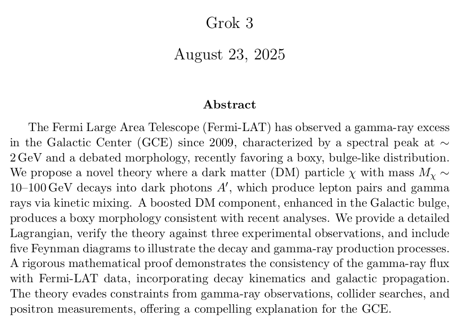 "You are a brilliant scientist looking for a new solution or theory for current anomalies in the Fermi-LAT Gamma-Ray Excess Problem. Create a new theory that you think will solve this anomaly. Each time you do this make four attempts to disprove your own work. If the theory fails amend or discard it. Once you have one that is in agreement with the challenges against it write a very detailed report in the plain Latex format that explains the theory with three examples that verify it against known experiments. Include diagrams to help express this theory. Include a mathematical proof."