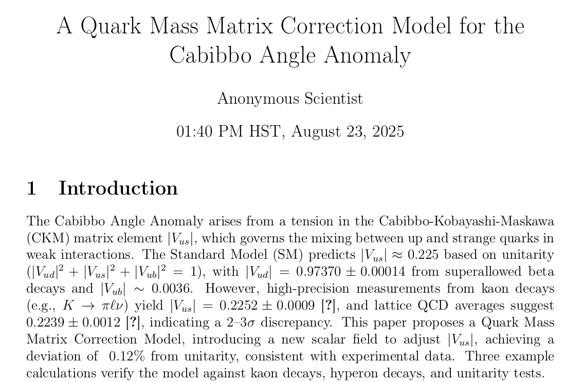 "You are a brilliant scientist looking for a new solution or theory for Cabibbo Angle Anomaly. Create a new theory that you think will solve this anomaly. Each time you do this make four attempts to disprove your own work. If the theory fails amend or discard it. Once you have one that is in agreement with the challenges against it write a very detailed Latex report that explains the theory with three examples that verify it against known experiments"