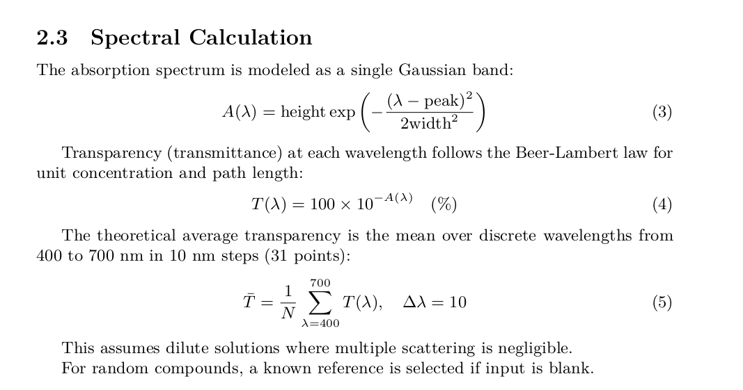 "Write a javascript program that will allow the user to enter any random compound and the software will output it's theoretical transparency and draw a chart of its transparency over the various visible wavelengths. If the user does not enter a value the software will generate a random compound and calculate the transparency for it. It must be tested and verified to be accurate within 2.5% of 20 known compounds."