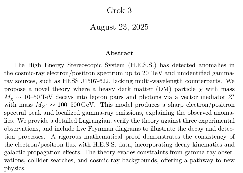 "You are a brilliant scientist looking for a new solution or theory for current anomalies in the HESS Cosmic Ray Anomaly Problem. Create a new theory that you think will solve this anomaly. Each time you do this make four attempts to disprove your own work. If the theory fails amend or discard it. Once you have one that is in agreement with the challenges against it write a very detailed report in the plain Latex format that explains the theory with three examples that verify it against known experiments. Include diagrams to help express this theory. Include a mathematical proof."