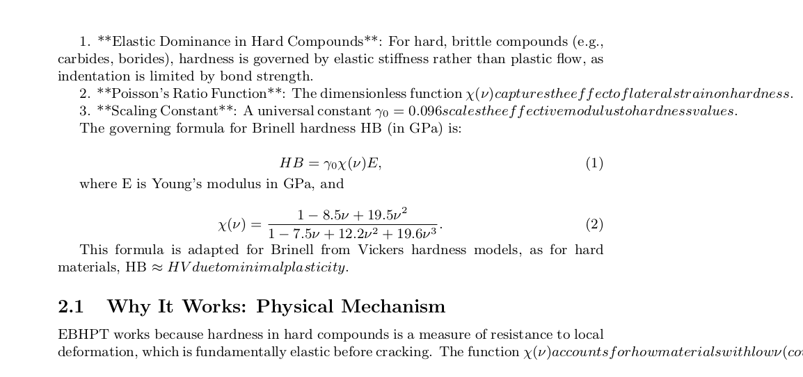 "I want you to create a new theory to calculate Brinell hardness in a compound. When you create this theory I want you to make 5 attempts to disprove it. If it fails amend or discard the theory until it passes all 5 criteria. If it passes write a plain latex paper explaining this new"